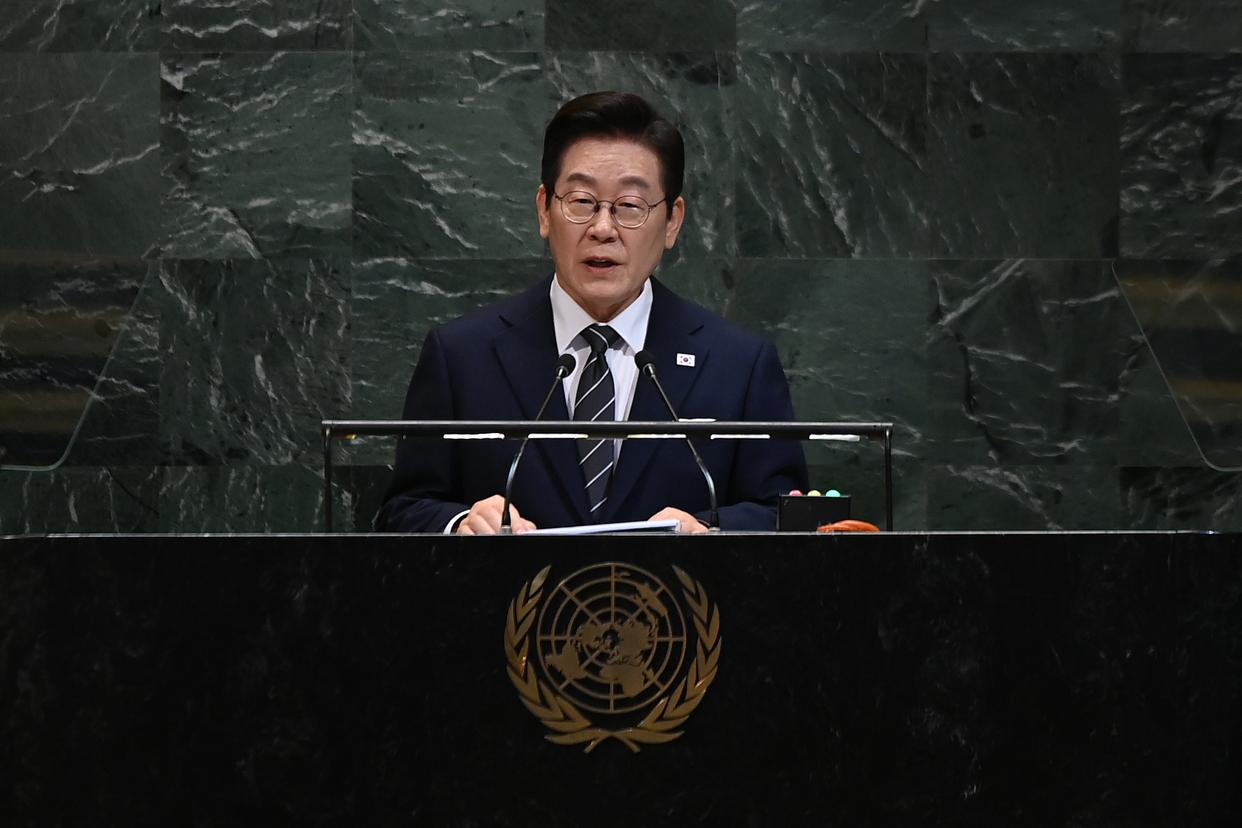 9月23日,在位于纽约的联合国总部,韩国总统李在明在第80届联合国大会一般性辩论上发言。新华社记者李睿摄